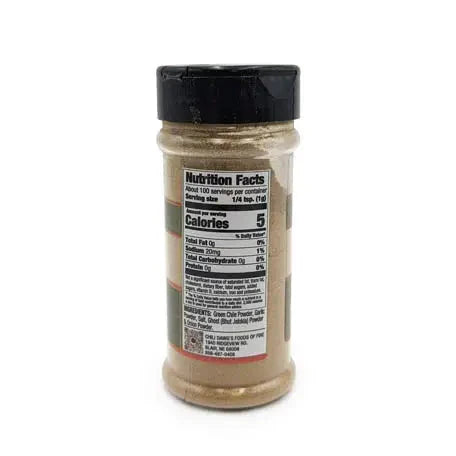 Ingredients: green chile powder. garlic powder. salt. ghost (Bhut Jalokia pepper) powder. onion powder