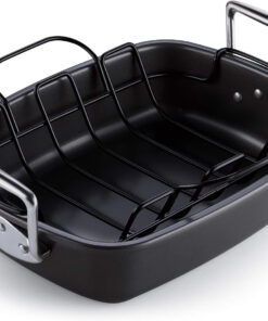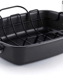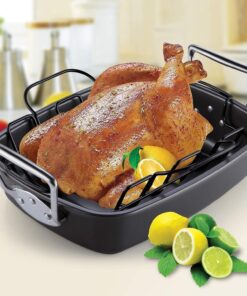 The Cook N Home nonstick bakeware roaster with Rack. 17×13 Is large enough to hold a 25lbs turkey. The durable nonstick coating is PFOA free and easy to clean. It comes with a rack that allows for even browning of meat and collects juices during roasting and also comes with sold cast riveted handles. The roaster is dishwasher safe. Oven safe and can be used for all cooktops including gas. electric. halogen and ceramic.