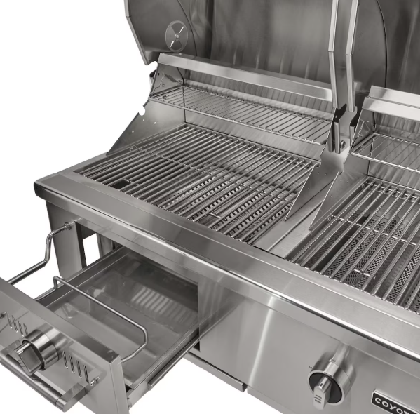 For the ultimate cooking enthusiast. the Coyote Propane & Charcoal Hybrid Grill provides unparalleled versatility. Featuring two high-performance I-Burners delivering 30.000 BTUs of grilling power. it also incorporates an integrated charcoal tray for those who crave the rich flavor of traditional charcoal or wood chip grilling.