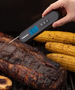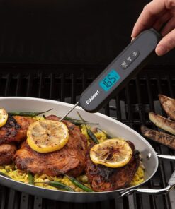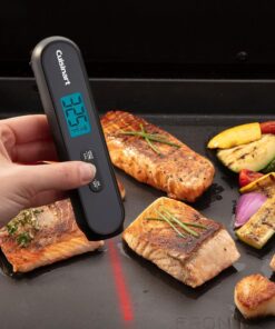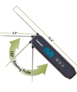 The Cuisinart Infrared & Folding Grilling Thermometer is a simple and effective way to check in on the readiness of your grilled meats and also read the temperature of the cooking surface. The 2-in-1 designed thermometer features a non-contact infrared thermometer and a folding probe thermometer that instantly and accurately measures temperature. It takes a temperature in a little as 2-3 seconds. and is accurate to +/-1 degrees up to 932ËšF and can switch ËšC/ËšF (probe can read up to 572 ËšF. IR reads up to 932 ËšF) with an easy-to-read backlit LCD screen. A built-in laser gives you the precision to hone in on the exact surface you want to measure. whether it is a pizza stone. grill. or griddle; it will also identify any hot spots on the cooking surface. This thermometer features a foldaway probe design for storage and safety. with an IPX3 water resistance rating. and the Hold button lets you see the temp easier. The calibration function adjusts the instant-read thermometer probe sensor back to the correct accuracy. Great for grilling. simply lock in the current temp when the probe is removed from food and keep the temp displayed. The Cuisinart Infrared & Folding Grilling Thermometer has a clip on the back so you can keep it close by when grilling or smoking.