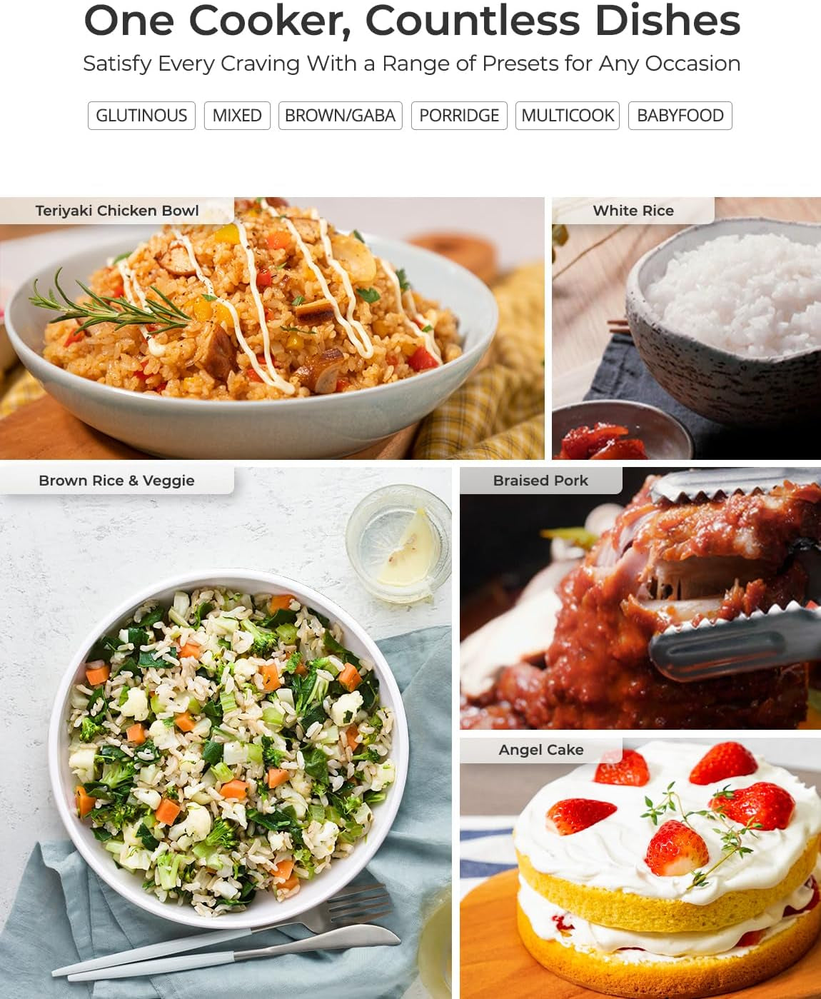 - VERSATILE MEAL PREP: Explore a variety of food options with this rice steamer—from glutinous white rice to brown rice. oats and porridge. even cake! Touch buttons and versatile menu settings allow you to enjoy the convenience of cooking a variety of dishes with ease.
