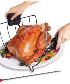 Keep busy hands safe and heavy tasks comfortable with Cuisipro’s helpful roasting rack. This lightweight chef’s aid features a long basket shape made of wide-set wires that securely hold up to 25 pounds of meat. Sitting on four legs. the rack fits in a 16-by-13-inch pan during roasting. then lifts out easily with the aid of two large handles on top. For efficient serving. set the rack directly on a platter or tray. pull out the long pin from the bottom. and the rack separates to neatly release the meat. The non-stick surface helps with a smooth transition and makes clean-up a snap. Cuisipro recommends hand washing for best results. and backs the product with a 25-year warranty. –Kara Karll