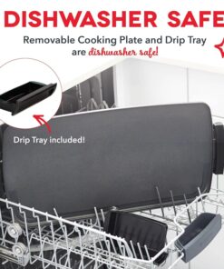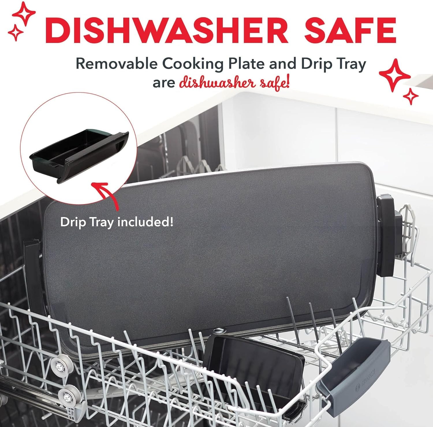 - NONSTICK & EASY TO CLEAN: The PFOA-free. non-stick Cooking Plate surface provides an even cook for consistent results. Comes with a heat-resistant. removable. dishwasher-safe Drip Tray to catch excess grease before it hits your countertop. making cleanup a snap