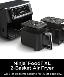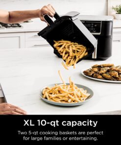 Meet the Ninja Foodi XL 2-Basket Air Fryer. that lets you cook 2 foods. 2 ways and finish at the same time. This bigger and faster air fryer has XL 10-qt. capacity and includes 6 versatile cooking functions. Not only is this great for large family meals and entertaining. but this air fryer also has DualZone Technology. IQ Boost. and Ninja’s Smart Cook System.
