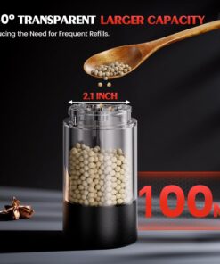 - 【360°Transparent Larger Capacity】: This electric pepper grinder features a large 360° clear container to minimize refills. allowing you to easily check the seasoning level and reduce waste. It also comes with a storage base to prevent tipping and ensure easy storage. Portable and lightweight. it’s perfect for parties. barbecues. and campin