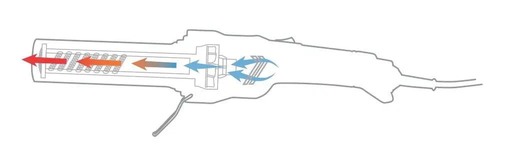 The first position of the switch produces super-heated air to start the fire. while the second position creates high-velocity airflow to fan the flames. The Electro-Torch also features a special protection feature: an automatic thermal switch. If the unit reaches an excessively high temperature that could potentially damage components. this switch engages and shuts off the unit. This can occur during extended operation or when excess heat builds up in the heating chamber. After 15-20 minutes. the unit cools down enough to restart.