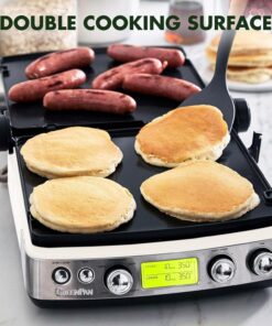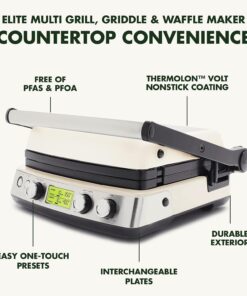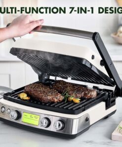 - 7-IN-1 DESIGN: Contact grill. panini press. grill and griddle. grill on one side. griddle on the other. plus real waffles.