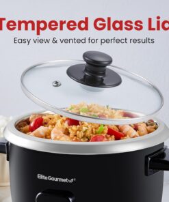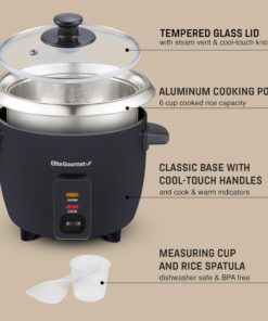 Cook perfect. fluffy rice every time with the Elite Cuisine Deluxe 6 Cup Rice Cooker. Makes up to 6 cups of cooked rice (using 3 cups of uncooked rice). No more waiting for water to boil or watching the pot on the stovetop. this unit automatically cooks rice and switches to Keep Warm when cooking is complete. keeping food hot and fresh before serving. It includes an easy to clean removable cooking pot. an easy to read measuring cup and spatula for easy serving and a tempered glass lid for convenient viewing.