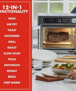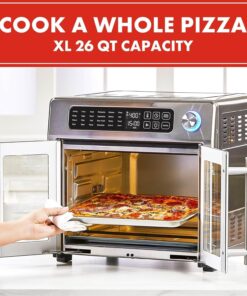 Its stainless steel exterior and elegant French doors not only enhance kitchen aesthetics but also facilitate easy access and monitoring with the interior light. With an extra-large 26-quart capacity. it serves 4–6 people effortlessly. accommodating everything from rotisserie chicken to a 12 pizza.