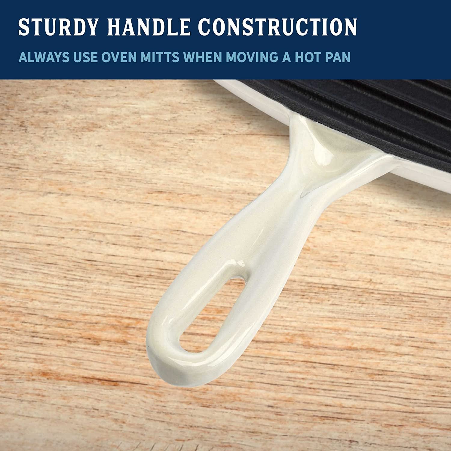 - HEALTHY COOKING: The raised. ribbed surface of the grill pan drains away excess fat and adds beautiful sear marks to your favorite dishes. Easily drain away grease or serve up gravy using the dual pour spouts. sturdy handle and additional helper handle.