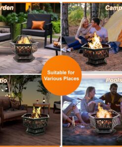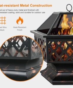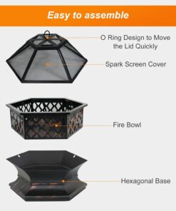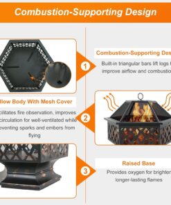 - 【Well-Ventilated & Dustproof】-Compared with other products. this outdoor/indoor fire pit has both chic appearance and practicality. It was designed in the special hexagon shape to extend heating distribution and accommodate irregular wood. The hex-shaped fire pit features a grid side cover and mesh screen to keep air and heat flowing come to you comfortably. while stopping hot ashes. debris. and sparks from flying around
