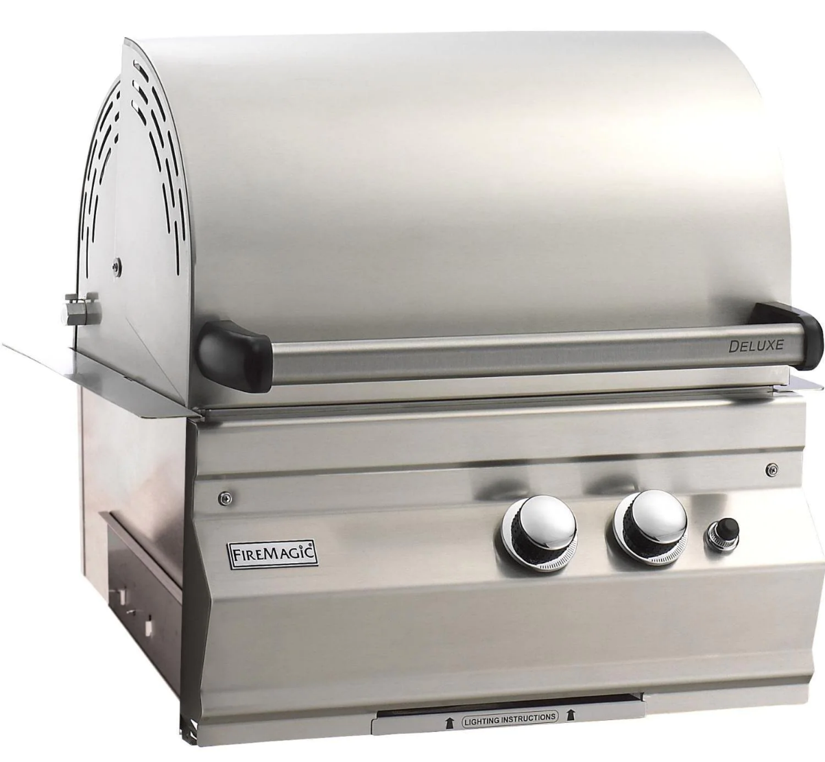 The Fire Magic Deluxe Gourmet Gas Grill features 368 square inches of total cooking area. stainless steel cooking grids and warming rack. a stainless steel exterior. and push button solid state electronic ignition system for easy lighting. The two cast stainless steel burners can be controlled separately. and provide 42.000 BTUs of total cooking power on the grilling surface. The included drip tray makes clean up a breeze.