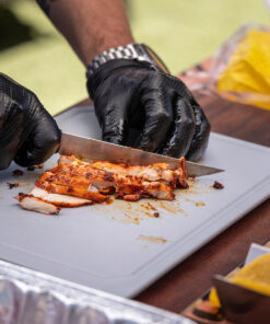 - Includes: cutting board. meat tenderizer. rib prep tool. BBQ shears. trimming knife. and 10 disposable nitrile gloves.