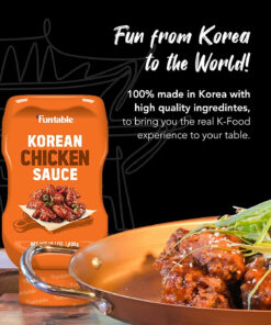 - FUNTABLE KOREAN CHICKEN SAUCE (400g/14.1oz) – Funtable Korean Chicken Sauce is a flavorful delight that adds an enticing twist to your everyday meals. Explore the global sensation of Korean chicken’s sweet and spicy taste by drizzling. dipping. or mixing it into your dishes. Enjoy the convenience of our mess-free squeeze bottle. making every meal more delightful.