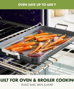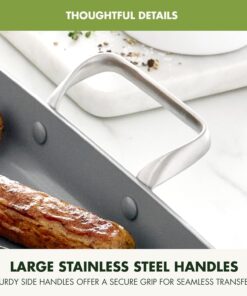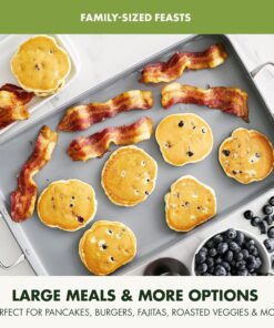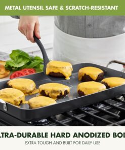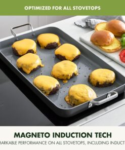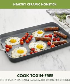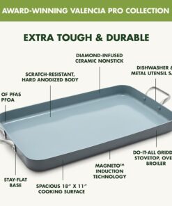 Designed for fast and even heat distribution. this spacious Valencia Pro double burner griddle offers plenty of room for big family spreads. short-order classics. and so much more. This pan features our signature healthy ceramic nonstick coating for effortless nonstick release without PFAS. PFOA. lead. and cadmium. The riveted stainless steel handles offer a safe and secure grip that makes it easy to take your meals to the oven.