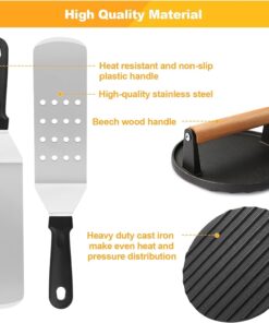 - 【PREMIUM MATERIAL】 Our flat top grill accessories are well made by heavy gauge stainless steel. Rust-proof and anti-corrosion. Sturdy structure design can hold more foods. The plastic handle is heat resistant and comfortable to hold. so you don’t have to worry about heat waves while grilling. The grill press is made with heavy-duty cast iron and the wooden handle is solidly installed. Easy to clean and dishwasher safe.