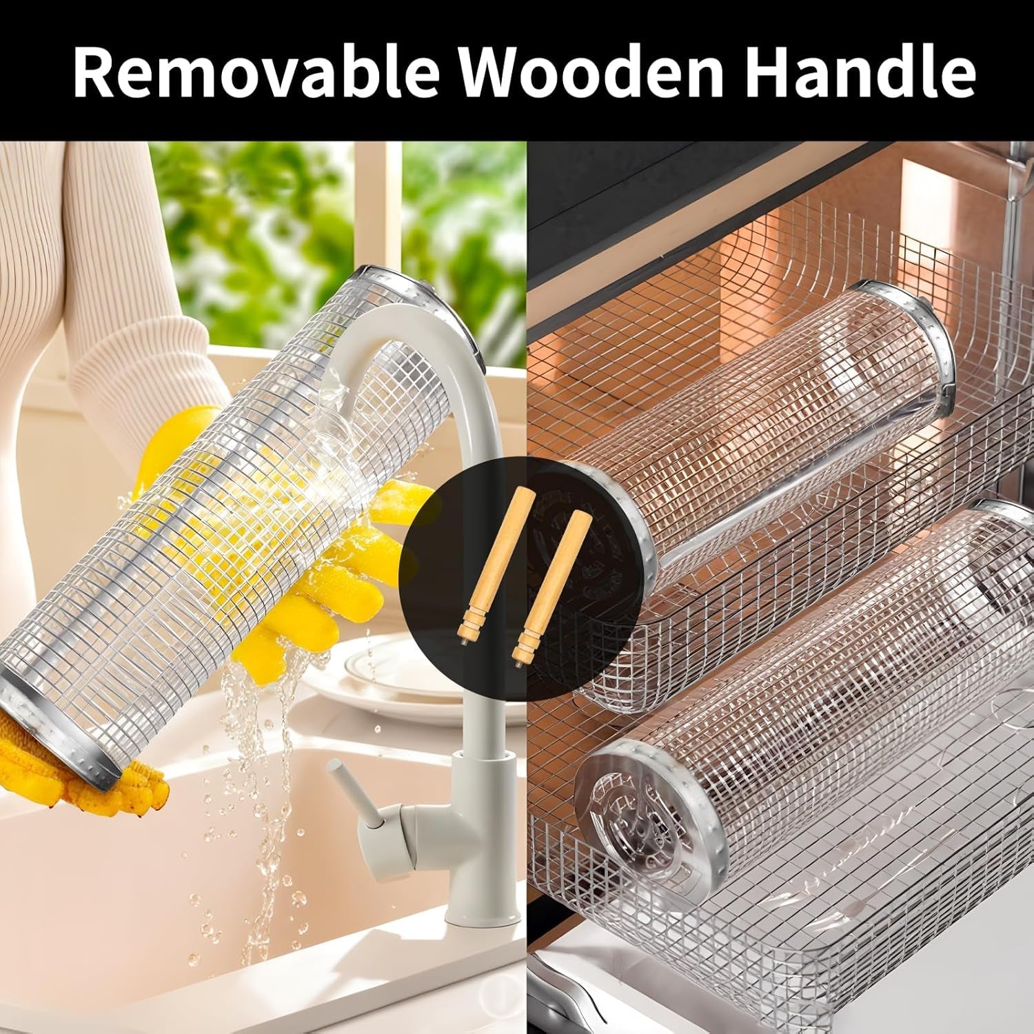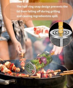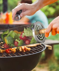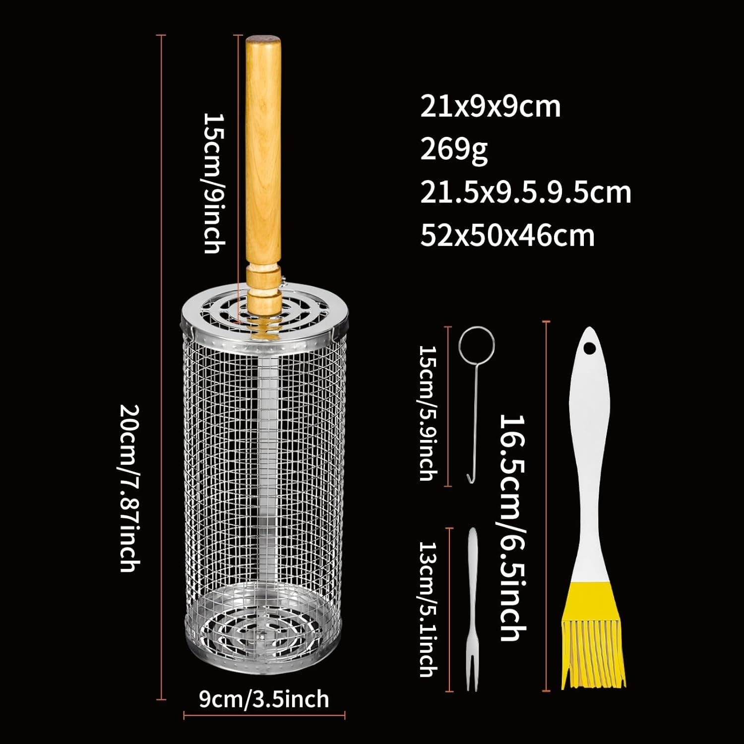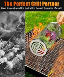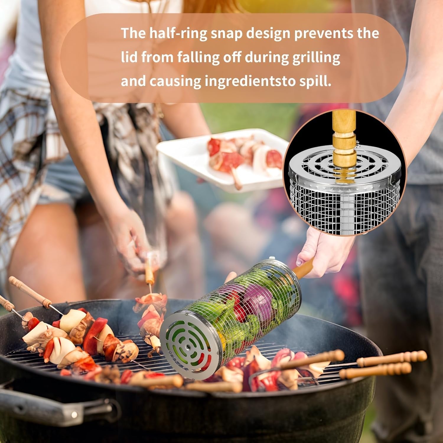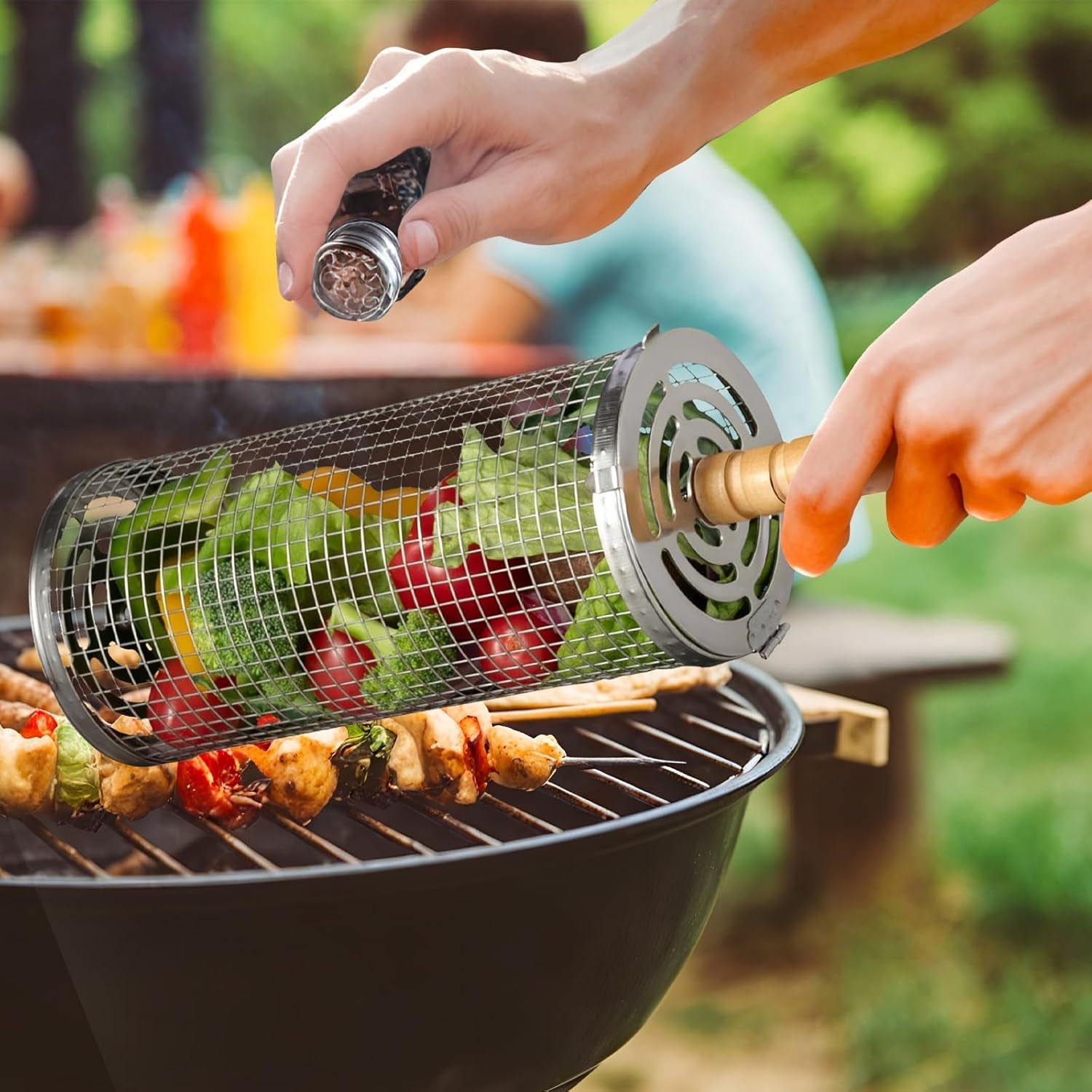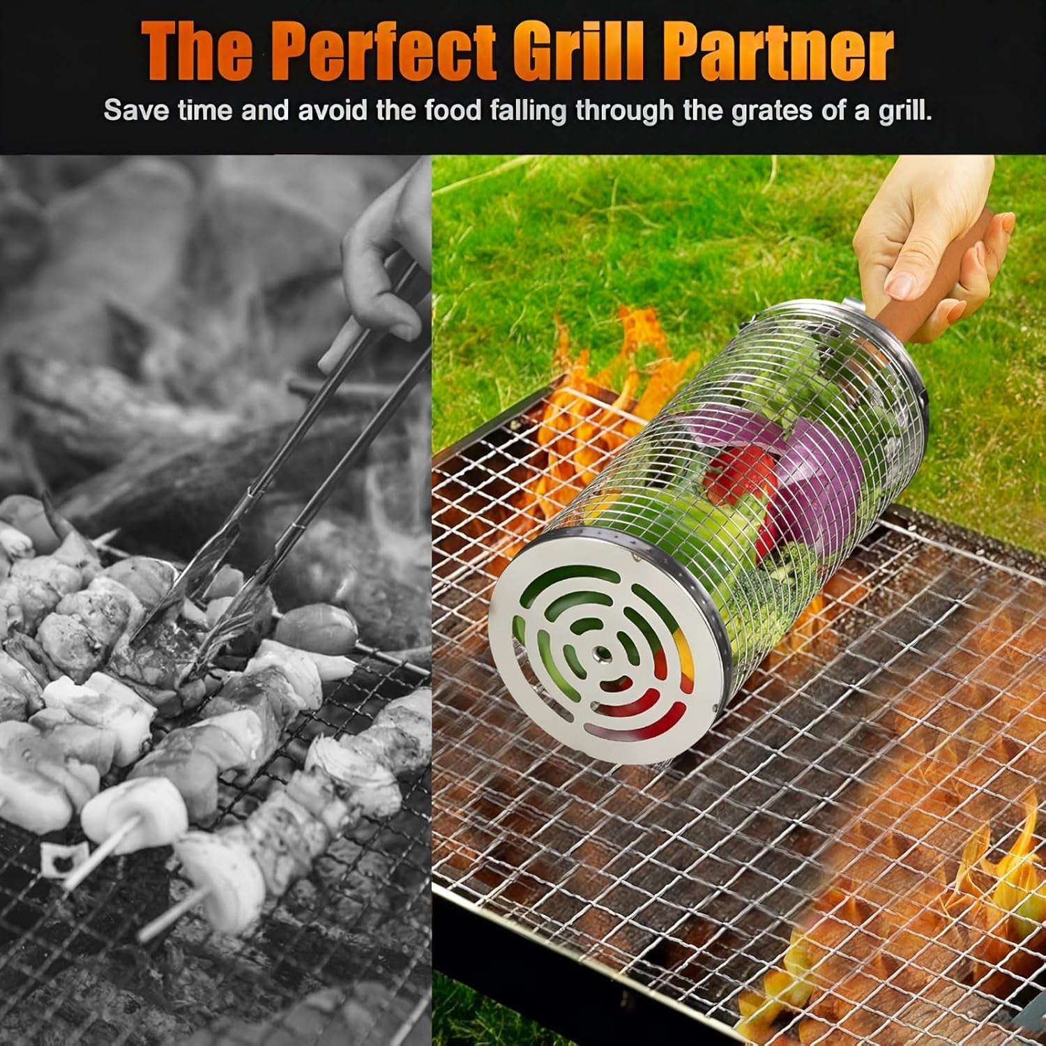 Grill Basket. Stainless Steel Grilling Accessories.Rolling Grill Baskets for Outdoor Grill with Wooden Handle. Practical Grilling Gifts for Men.Bbq Accessories Tool for Vegetable Shrimp. Outdoor Cooking Camping. Birthday Gifts for Men Dad Husband