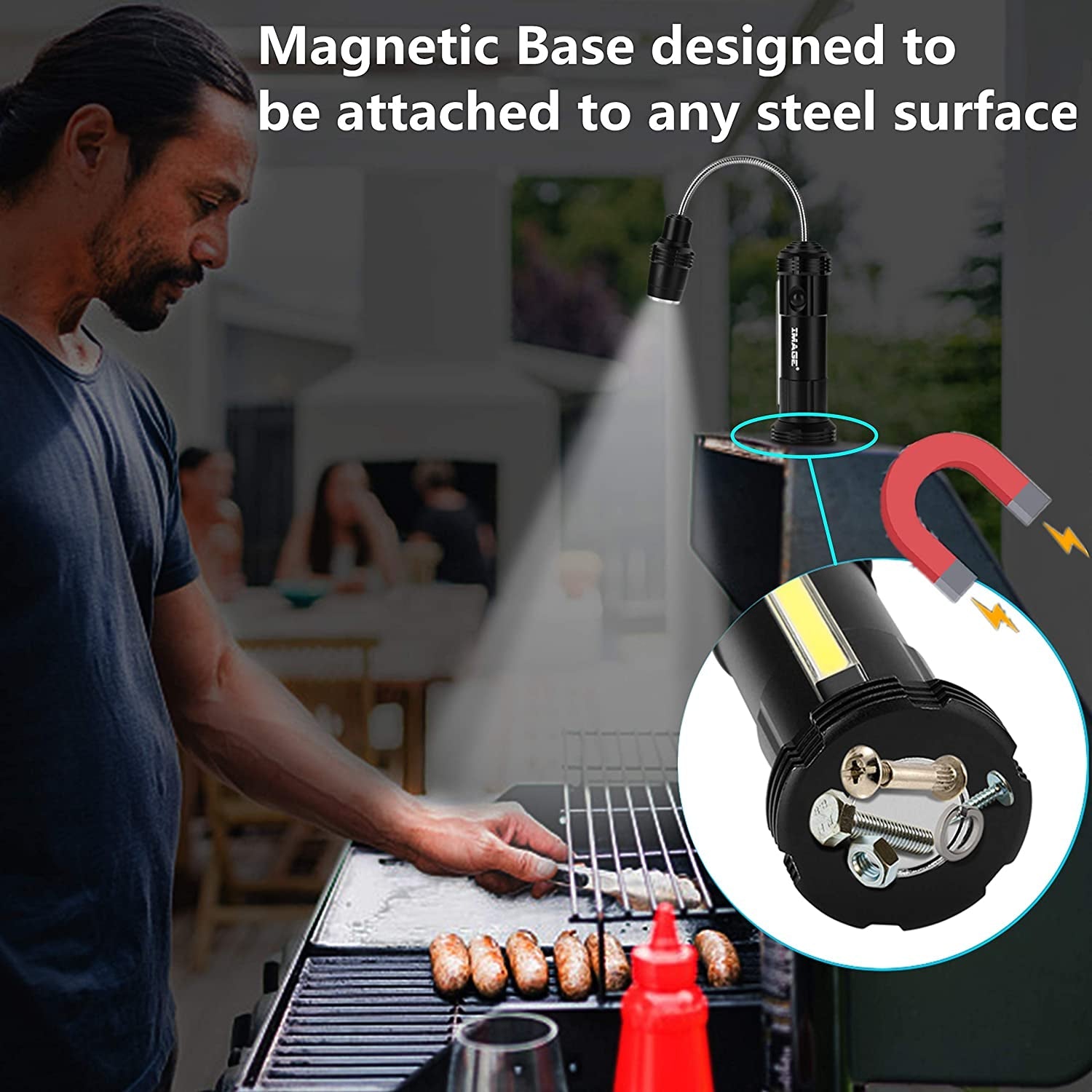 - STRONG MAGNETIC MATERIAL: This BBQ grill light is possessed of a powerful magnetic base that it can be abosorbed on most metal surfaces. like on gas. charcoal and electric grill. anything that relates to magnetism and in this way. it makes easy for you to fix it on the metal objects.