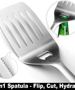 - Featured easy to use & store design: Rubber insulation in the handle provides you with a comfortable and soft grip feeling; 3in1 spatula works as an ingenious knife. bottle opener and a turner. saving you space and hassle; Not to mention the strong fork and dense silicone brush or the lockable extremely eye-catching tongs. far more than enough to be qualified for their specific jobs; Each grilling tools for outdoor grill got a large ring for easy hanging anywhere;