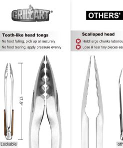 - All under control – creative tooth-like head tongs: Our newly designed tongs can provide greater control over food. such as being able to bite food of any size more accurately. easily and safely without tearing. falling or feeling laborious -exactly something that’s difficult for common scalloped head tongs to achieve. but it’s also the most basic function a good BBQ tongs must meet. Just as a painter needs his brush. a grill master needs the right grill tongs. With us. you can never go wrong!