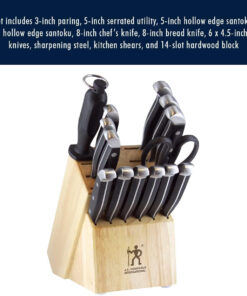 - SET INCLUDES: 3-inch paring knife. 5-inch serrated utility knife. 7-inch santoku knife hollow edge. 8-inch chef’s knife. 8-inch bread knife. 4.5-inch steak knife set of 6. professional honing steel. kitchen shears. and hardwood knife block