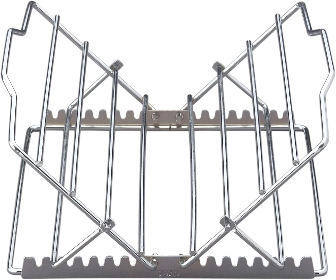 HIC’s Adjustable Roasting Rack is an invaluable addition to cooking utensils and chef tools for cooking. baking. roasting. and broiling. It easily adjusts to 7 positions for cooking. baking. roasting. and broiling various-size cuts of meat. Foods are elevated above fat drippings so heat circulates more evenly for faster cooking times. all-over browning with less calories. It’s perfect for beef. chicken and turkey. pork. game. and more. It performs beautifully for preparing lunch or brunch. holiday meals. party buffets. or foods for outdoor entertaining. Made from heavyweight chrome wire. it’s durable and oven safe to 500-degrees Fahrenheit. It won’t scratch surfaces and resists rust. The reinforced base adds stability during the roasting process. Always use inside a roasting pan or on a cookie sheet or baking sheet. It measures 11.25 x 10.625-inches. is easy to use and easy to clean. Hand wash in warm. soapy water.