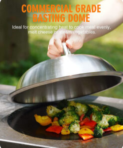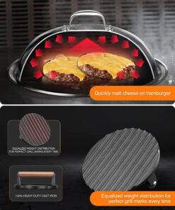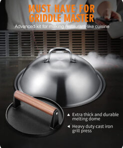 - [Cook Evenly] The griddle melting dome is Ideal for concentrating heat to cook meat evenly. melt cheese or steam vegetables. The bacon press can be seasoned like cast-iron skillets to create a non-stick surface.