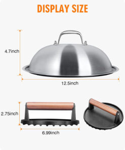 - [Large Diameter] The diameter of griddle steamer dome is up to 12.5 inch. it can cover multiple hamburger patties and large amount of veggies with a larger coverage area that the dome create. The cast iron burger press is round shape about 7 inch diameter and perfect for burgers. bacon.chops and steaks.