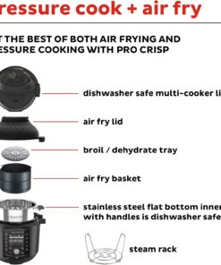 Cook and crisp like a pro with the Instant Pot Pro Crisp™ Pressure Cooker + Air Fryer. the one-pot wonder that does it all with 2 innovative lids! It replaces 11 kitchen appliances: pressure cooker. slow cooker. steamer. sauté pan. food warmer. sous vide. air fryer. roaster. mini oven. broiler. and dehydrator. With pro-level upgrades to the inner pot and lids including advanced heat protection. enjoy quick and convenient cooking with just a switch of the lid. The Instant Pot Pro Crisp offers the quality. convenience and versatility you’ve come to expect from Instant – discover amazing. Customizable air frying range of 70 degrees Fahrenheit (21 degrees Celsius) to 450 degrees Fahrenheit (232 degrees Celsius).