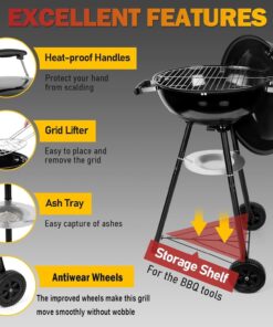 - 【THOUGHTFUL】 Heat-proof handles prevent your hands from being burned. Lid hook to make the lid handy and also make it act as a windbreak. Upgraded wheels ensure rolling on different ground smoothly without cracking. Able to withstand weight while remaining stable. Bottom shelf provides an additional storage space for your bbq accessories. Removable ash tray make it easy to catch ash and clear away
