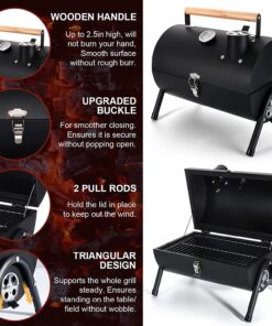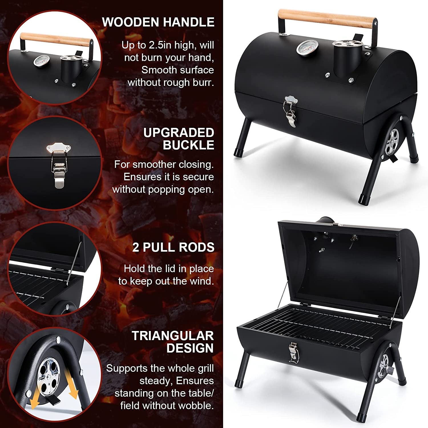 - 【HEAVY DUTY】 TRIANGULAR STRUCTRUE – keeps standing stably on different grounds. Greatly enhances the stability of the whole grill. WOODEN HANDLE – Anti-scald for easily open and move. The upgraded buckles can be opened and closed smoothly. Firm enough to ensure will not popping open when carrying. 2 PULL RODS – Hold the lid in place to keep out the wind