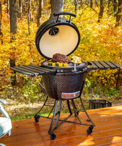 Using the highest grade of ceramics. the PBK22 gives every home chef the ability to serve the finest in gourmet charcoal cooking. Have a party with the 573 total square inches of cooking space. or make a feast for one. Either way. this is charcoal grilling at its finest. The PBK22 provides you with versatility for all your grilling and smoking needs and the two fold-down laminated composite side shelves aid in those needs. Standing 52 high and 45.9 wide. the PBK22 moves with easy thanks to the four heavy duty swivel casters and wheels. two of which. have locking mechanisms. The shock-absorbing plunger. for additional protection against slamming. and included polished black steel ash tool kit show just how much time and thought we put into making your charcoal barbequing experience nothing short of outstanding.