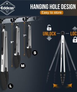 - LOCKING MECHANISM & PULL-RING TECHNOLOGY – Eddeas ring-pull technology will keep your tongs from opening and closing accidentally which will allow you to facilitate better control while using them. And can be conveniently dried and stored. the tongs easily become compact when you pull the easy pull lock up. they fit seamlessly in most drawers and cabinets for easy storage; also include a hook for easy hang