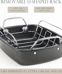 - U-SHAPED ROASTING RACK: The thicker U-shaped rack with upward handles is easy for taking out food while keeping meat far away from the bottom to make it evenly heated and prevent from being immersed in extra grease and juice.
