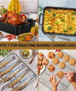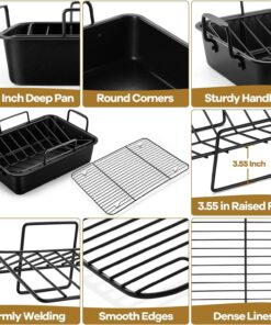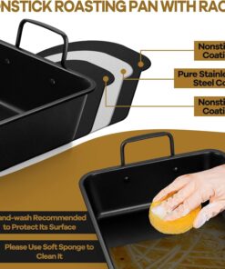 - 【NON-STICK & EASY TO CLEAN】Our roaster pan with racks are coated with non-stick coating. Nonstick and smooth surface avoids the food sticking on the pan and rack. Easily cleaned by hands with soft dishcloth and soapy water. Please do not use steel wool to clean them for prolonging their service lifetime