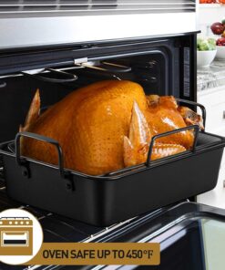 - 【NON-TOXIC & DURABLE】P&P CHEF non-stick roasting pan with baking racks are made of food-grade material without harmful substance releasing to your food. Oven safe up to 450℉. Heavy-duty stainless steel core structure makes them more rust-proof and sturdier than aluminum pan rack or other normal metal core nonstick pan rack