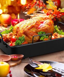 - 【WELL-MADE ROASTING PAN】15.25 Inch roasting pan is perfect for roasting turkey chicken. baking lasagna brownie. 3.75 deep side can contain more food or sauce without spilling out. Keep your oven tidy. Firmly riveted handles ensure sturdy and safe holding. No worries of falling apart. Round corners help to easily clean food residue