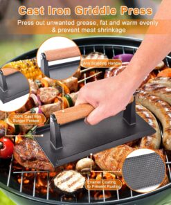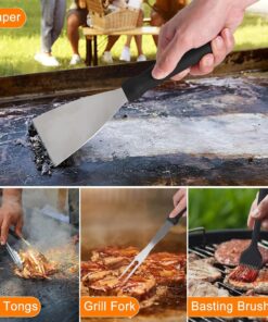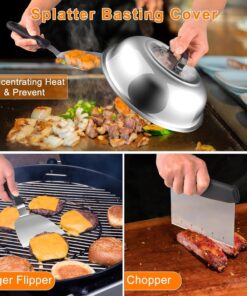 - 【Complete Selection of Grill Tools】Kit includes spatulas. griddle press. burger flipper. tongs. seasoning bottles. lids. cleaning brushes. etc. to meet the needs of all forms of indoor and outdoor grilling. The long handled spatula makes quick work of tossing large quantities of food. the lid concentrates heat for quick heating and splash-proofing. Barbecue press can squeeze out excess fat. heat evenly. and prevent meat shrinkage; and the cleaning brush saves time and effort on cleaning.