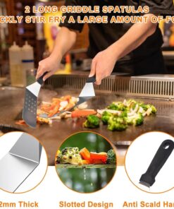 - 【Perfect 24Pcs BBQ Accessories】This griddle accessories kit includes: 1* long griddle spatula. 1* slotted spatula. 1* cast iron griddle press. 1*burger flipper. 1* slant edge scraper. 1* meat fork. 1* basting cover. 1* tongs.1* 3-sided bevel & griddle spatula. 2* squeeze bottles. 1* chopper. 5* S-shaped hook. 2* egg rings. 1* cleaning brush. 2* spice shakers. 1* sauce brush. 1* storage bag. 1* gift box.