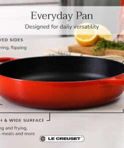 The enameled cast iron Signature Everyday Pan has a generous depth and wide surface area that is perfect for everything from pan roasting and frying to one pan meals. simmering sauces and more – it essentially combines the benefits of a braiser with the ease of use of a fry or sauté pan. Slightly curved sides make it effortless to stir. flip and serve. while oversized handles provide a secure grip for transferring from stove to oven to table.