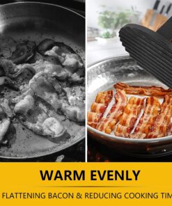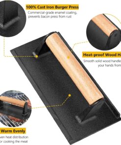 - Heavy duty cast iron. the burger presses are made of commercial food grade hard alloy. won’t sticky food. Heavy enough to save effort comparing with those stainless steel made. These bacon presses have sturdy construction that can stay in position. you can press meat without holding the grill press. suitable for long-term use