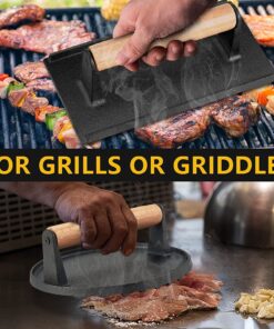 - Wooden handle. has ergonomic design to reduce hand fatigue while ensuring a secure and comfortable grip. Made of natural wood. the handle of meat press is smooth without any burrs. insulate heat transfer that’s heat-proof and always remain cool to touch. Firmly attached to the cast iron smash burger press with two screws