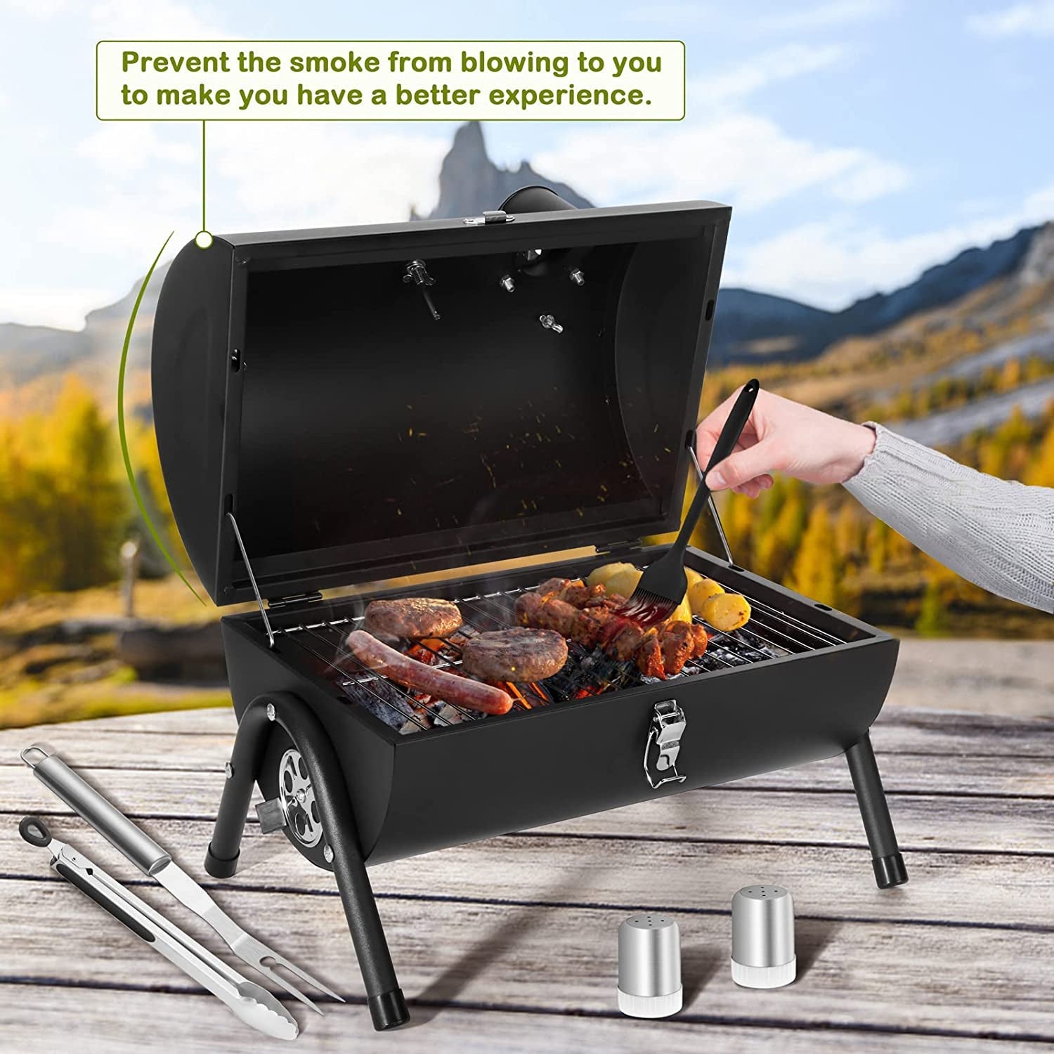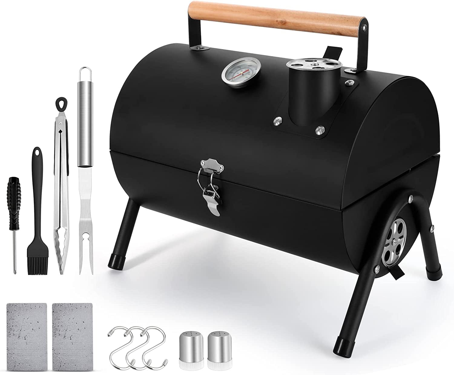 - Premium material & Package. portable charcoal grill is made of 0.6mm iron and high-temperature powder surface. withstand heat up to 752℉ and resistance to peeling. easy to clean and has a long service life. Package contains 1 x charcoal grill. 1 x barbecue fork. 1 x tongs. 1 x silicone brush. 2 x pepper pots. 2 x grill bricks. 3 x hooks. 1 x screwdriver for fast installation in 5 mins