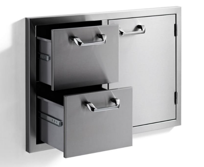 Make your outdoor kitchen the showpiece of your backyard with premium Sedona by Lynx accessories. The Lynx 30-Inch LSA530 double drawers and access door are made of stainless steel with stainless steel hardware for long lasting use and storage. The professional style barrel hinges on the doors and the drawer glides allow for a full opening so you can reach your tools and accessories. The heavy duty latches allow you to easily close the doors.