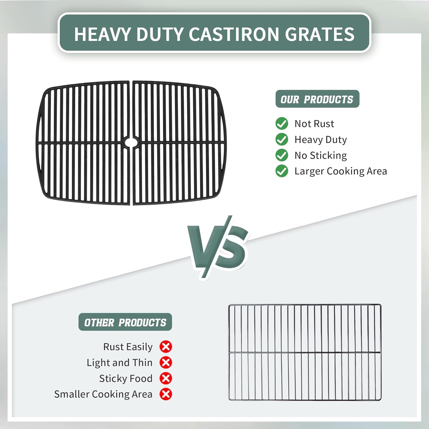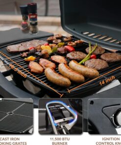 - ❤COOKING SYSTEM – This propane gas grill Includes powerful U-shaped stainless steel burners. total output 11500 BTU. two cast iron grates are perfect to cook meats. seafood. or veggies on the 266 sq in cooking space. hose and regulator included