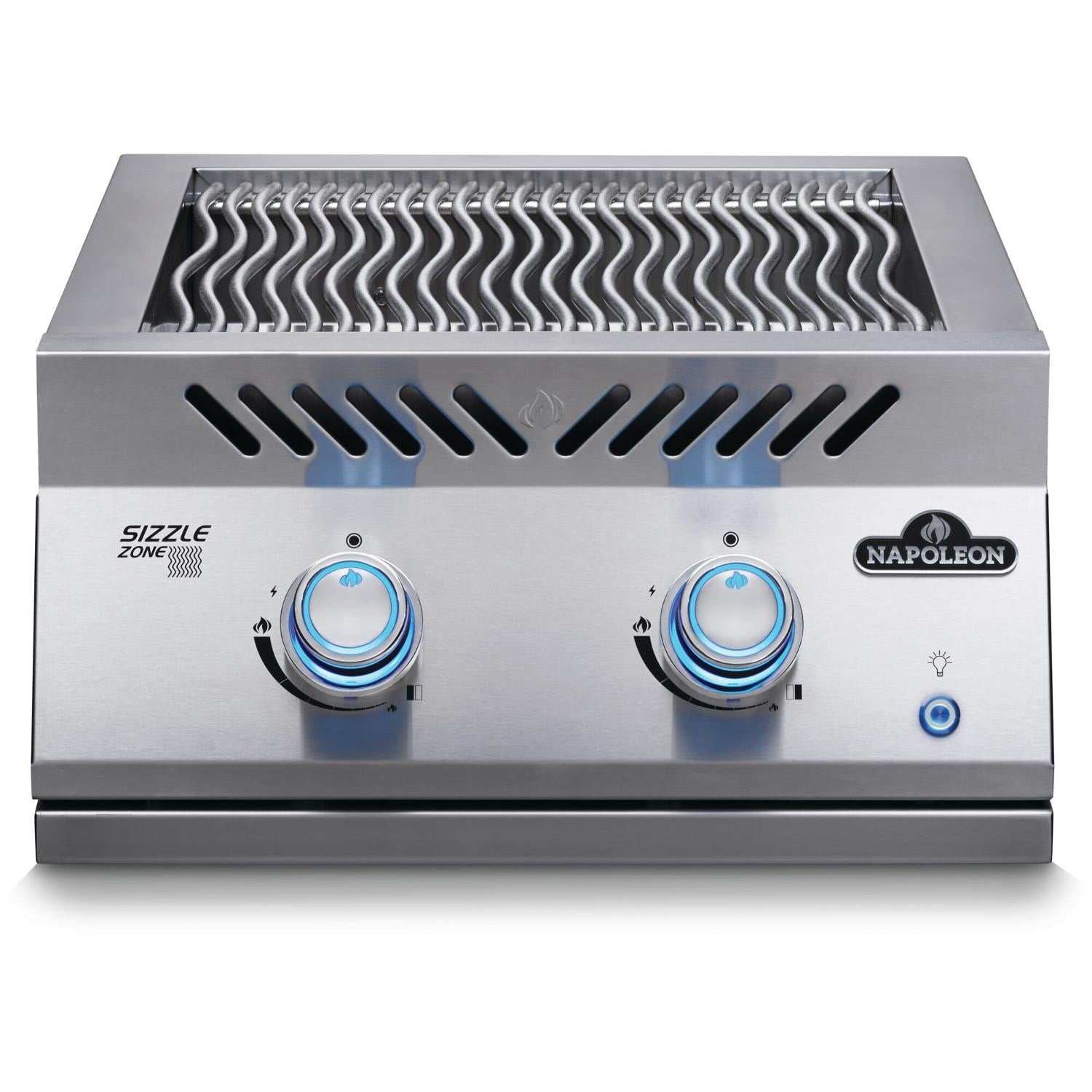 The Napoleon Infrared SIZZLE ZONE Burner provides extra space to cook restaurant-quality steaks over very high heat in your outdoor kitchen. Made from marine-grade stainless steel. this dual burner drop-in side burner ensures a long life and matches the quality of Napoleon’s 700 Series built-in grills. The burner features NIGHT LIGHT Control Knobs with Safety Glow. turning red when the burner is on for added safety and ambiance. The thick. 75 mm stainless steel cooking grids with the Napoleon WAVE pattern deliver iconic sear marks. and the Infrared SIZZLE ZONE can be used to produce the perfect sear on meat or used to create sides and sauces while the main grill is in use. Please note that the power supply kit N370-1091-SER is required for use with all Built-in 700 Series burners being used in an application without a Built-in 700 Series Built-in Grill to power the NIGHT LIGHT control knobs.