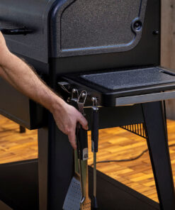With an included folding front and side shelf. you’ve got all the extra space you need for food prep and storage. right out of the box. The tall. tapered legs provided a powerful. ergonomic stance for easy-on-the-back grilling. Also making your life easier is improved hopper pellet cleanout (now positioned underneath for gravity to do its thing). easy ash cleanout with the removeable undermount burn pot. a roll top lid design. and a rapid igniter to get grilling faster than ever before.