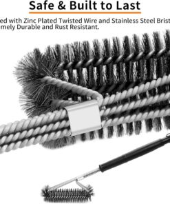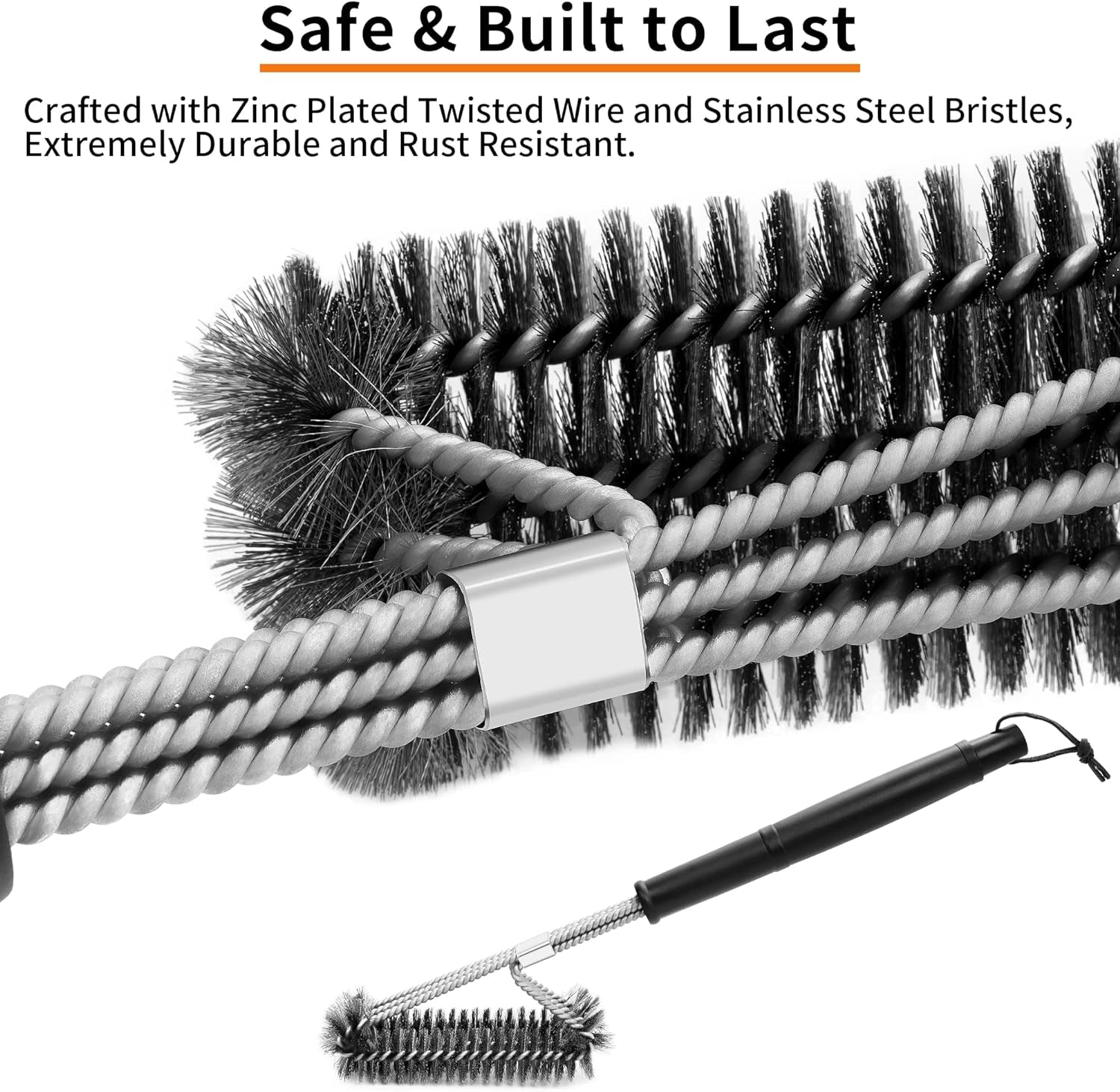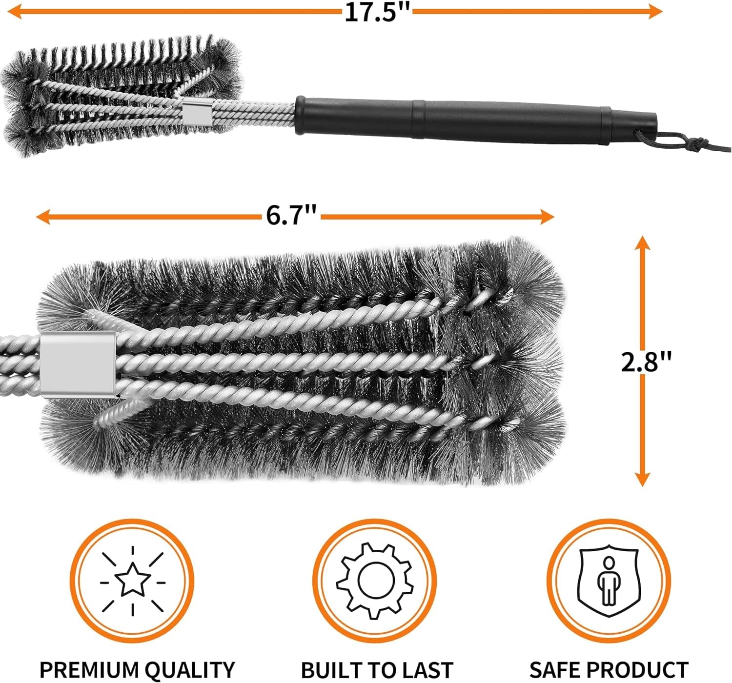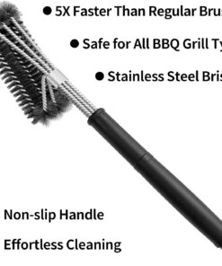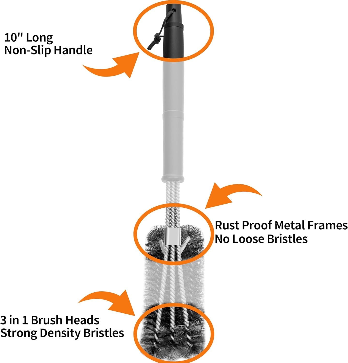 - 3 in 1 BBQ Brush Tool – Triple head with thicker and heavy-duty stainless-steel bristles– can effortlessly cover and clean larger area at one time. Quickly remove stubborn stuck-on debris with ease. for easy and efficient cleaning of your grill.