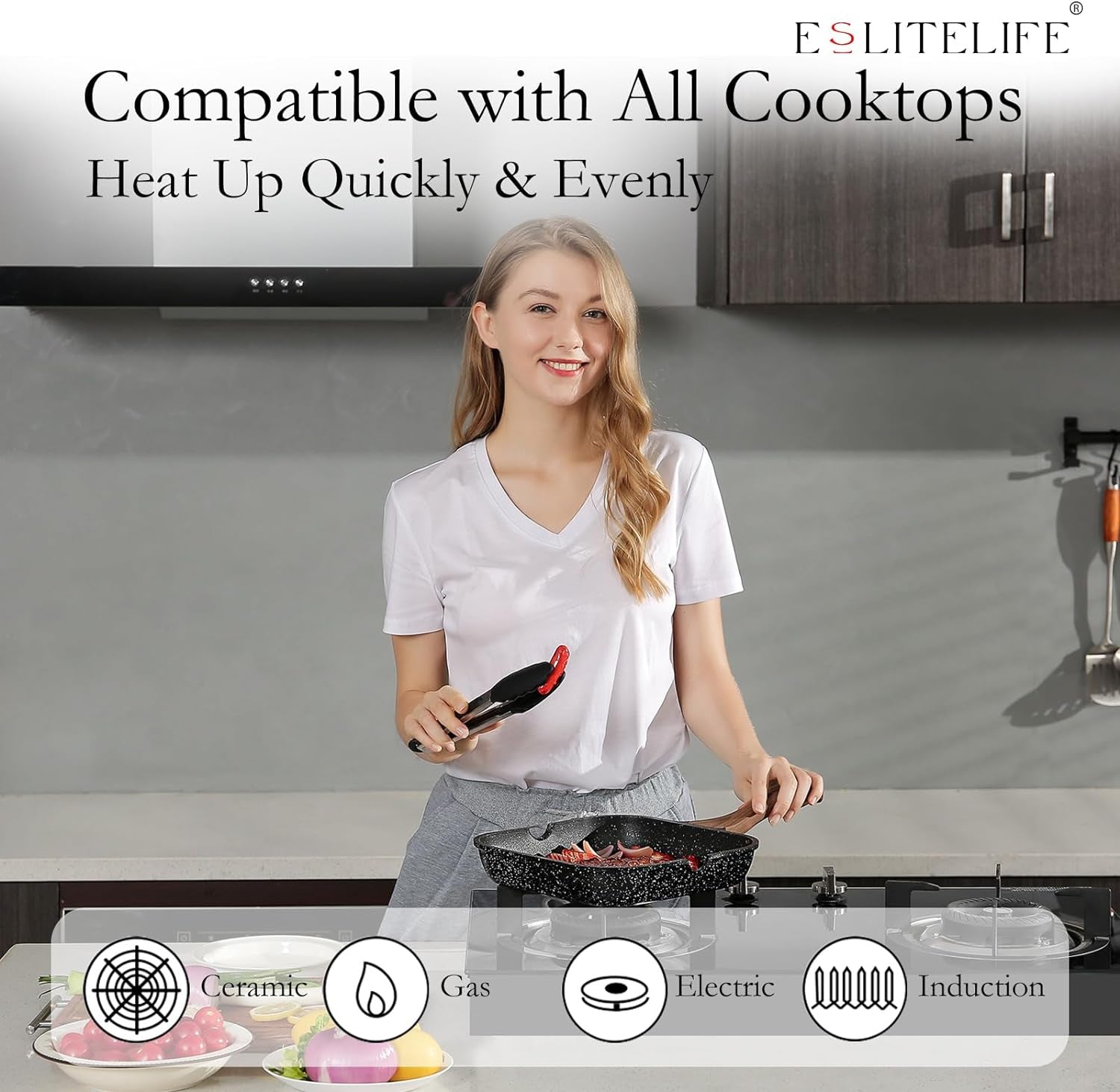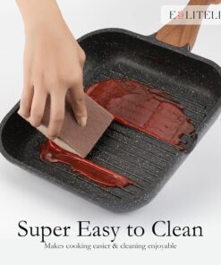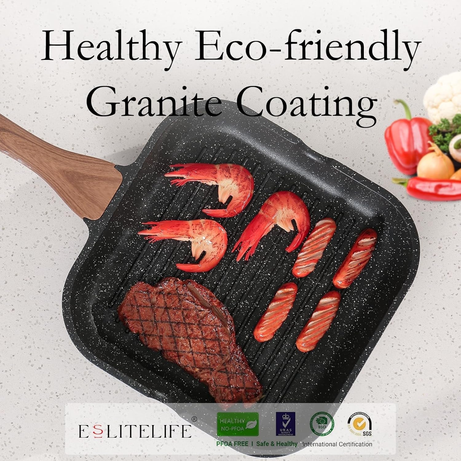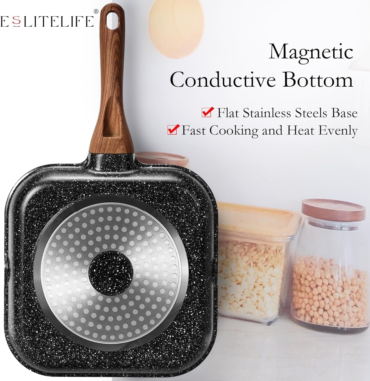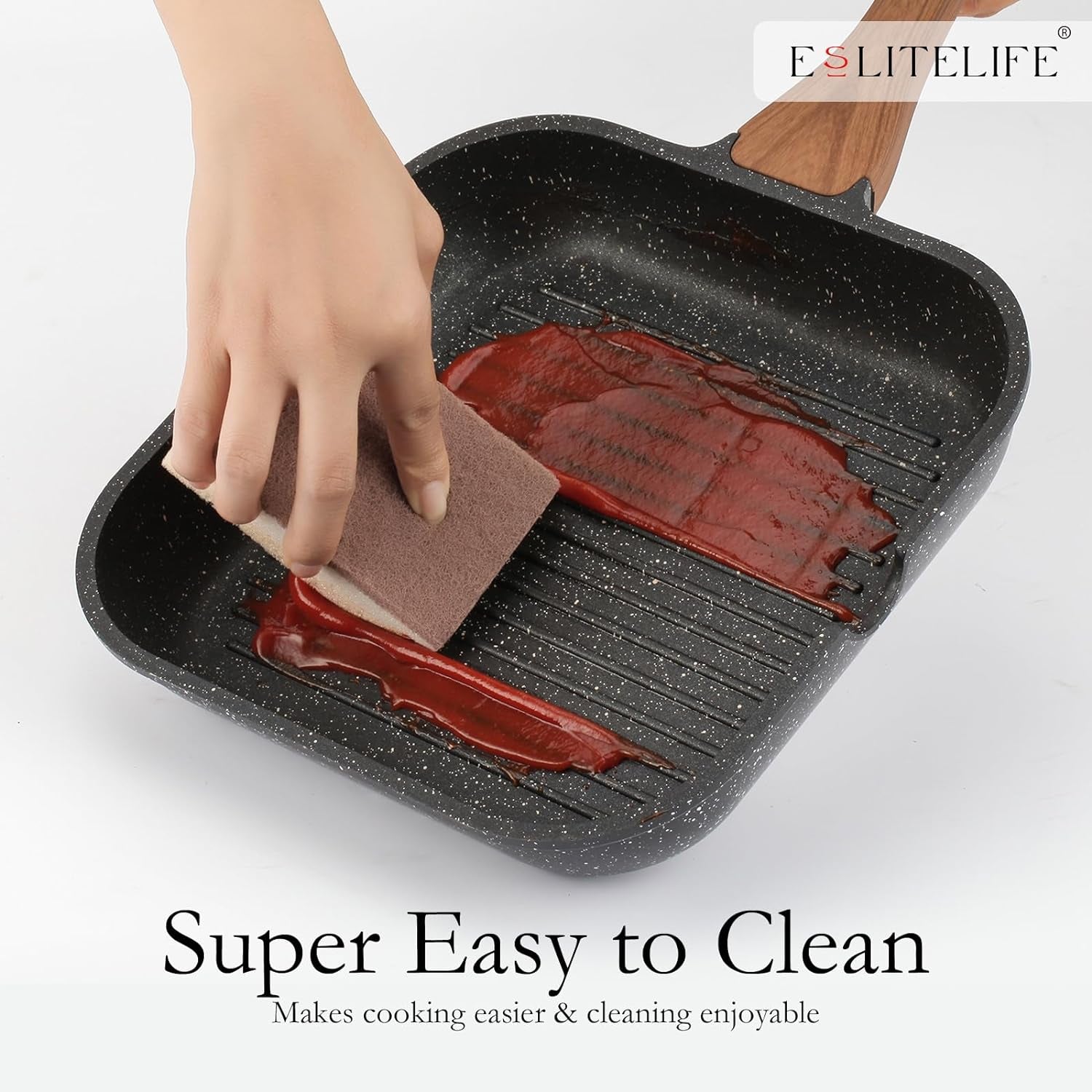 Nonstick Grill Pan for Stove Tops. 9.5 Inch Granite Coating Square Grill Skillet with Pour Spouts. Compatible with All Stovetops (Gas. Electric & Induction). PFOA Free
