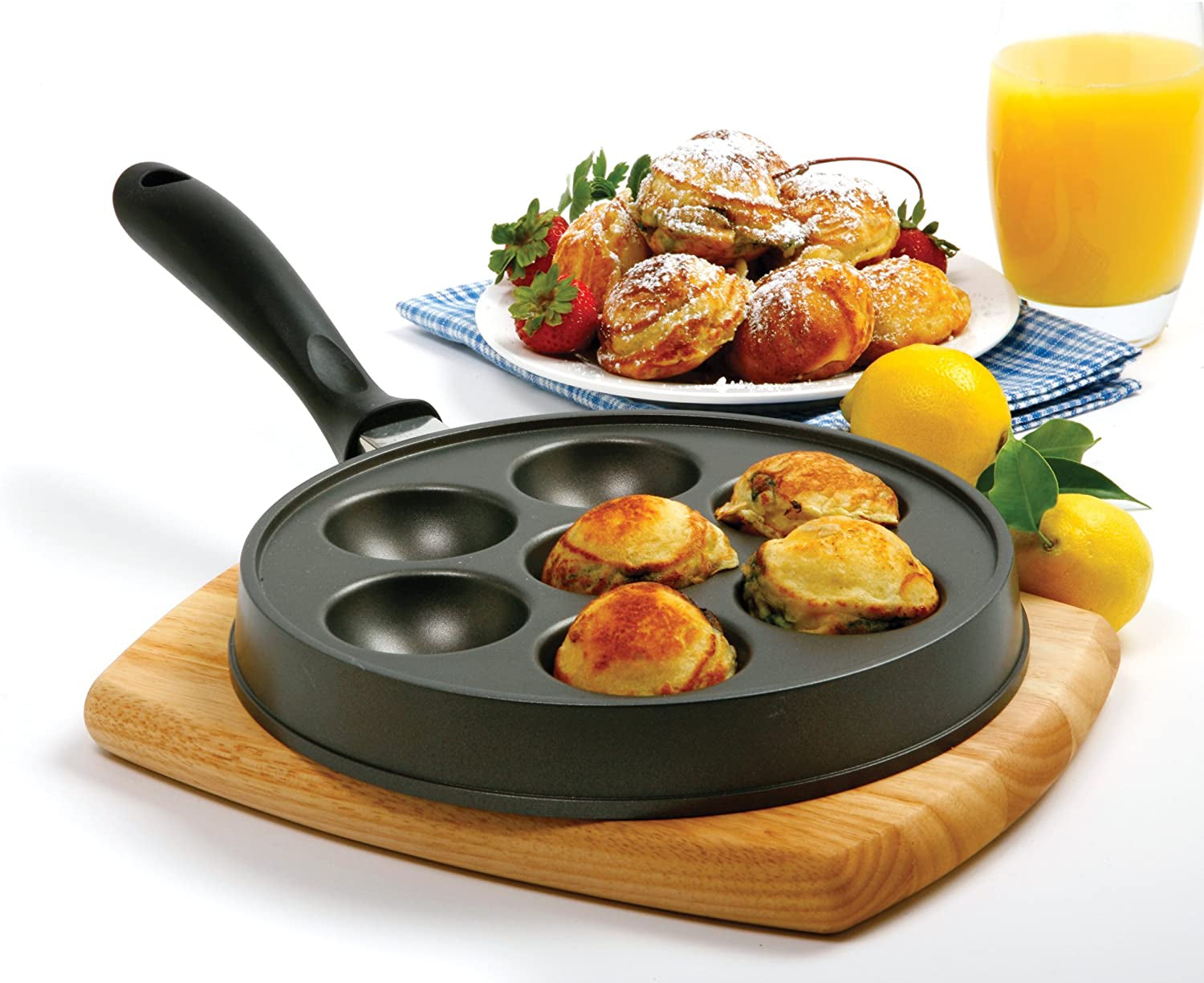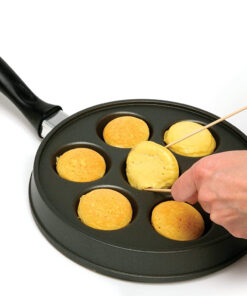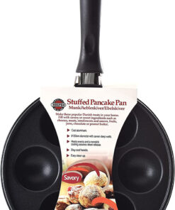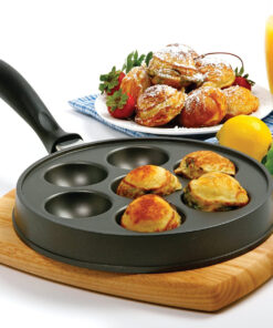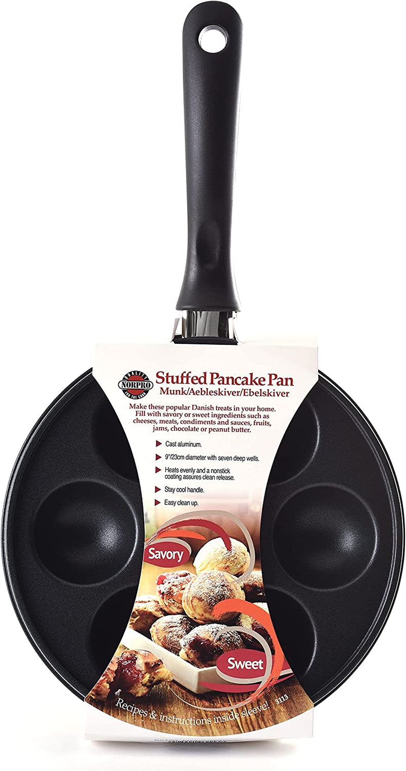 Make the popular Danish treat Aebleskiver. filled pancakes. in your home!Serve sweet or savory anytime! Fill with fruit. jam. cream cheese. peanut butter. cheese. chocolate or meats like sausage. ham or bacon. Top with syrup. jam or powdered sugar. The possibilities are endless! Cast-aluminum construction heats quickly; nonstick surface. Ergonomic 7-1/2-inch-long handle stays cool to the touch. Recipes and instructions included.